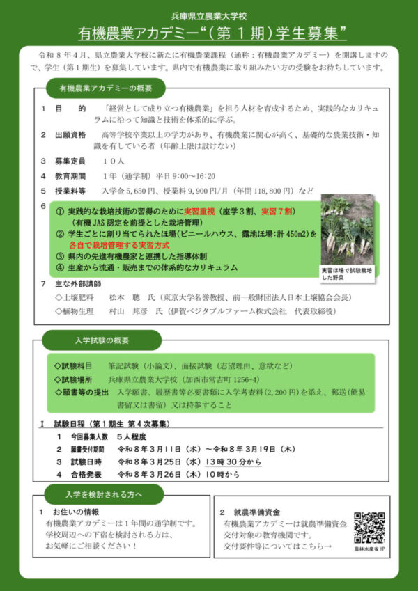 兵庫県では、有機農業の取組をより一層拡大するため、「経営として成り立つ有機農業」を実践する担い手や地域のリーダーとなり得る人材を育成するため、県立農業大学校に有機農業を体系的に学ぶ有機農業アカデミー(有機農業課程)を開講します。