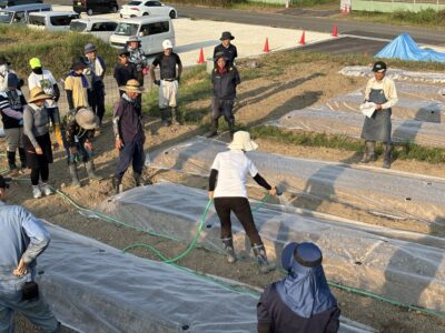 ほ場実習では、太陽熱養生処理を施した畝に、ダイコン、カブ、ニンジン、ホウレンソウを播種しました。加えて、レタスとサニーレタスの直播栽培にもチャレンジ。播種後の畝には防虫ネットをべた掛けし、害虫対策を行いました。