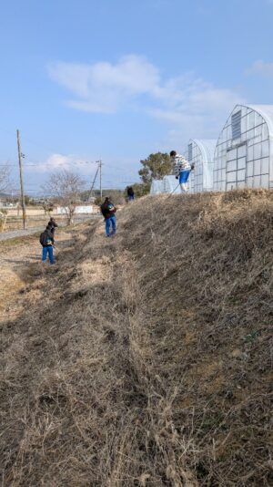 今日は、有機農業アカデミーの法面の除草作業を行いました。寒い中での作業でしたが、除草をすることで景観が整い、とてもきれいになったと感じました。有機農業アカデミーでは除草剤を使用することができないため、雑草は病害虫の発生源となることもあり、今後は防草シートを張って雑草が生えないようにします。
